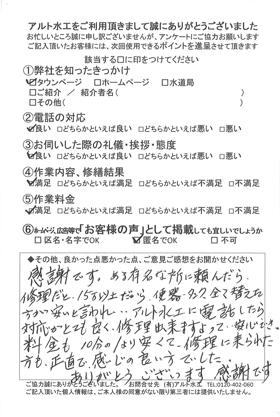 また何かございましたら、アルト水工までご一報いただければと思います。